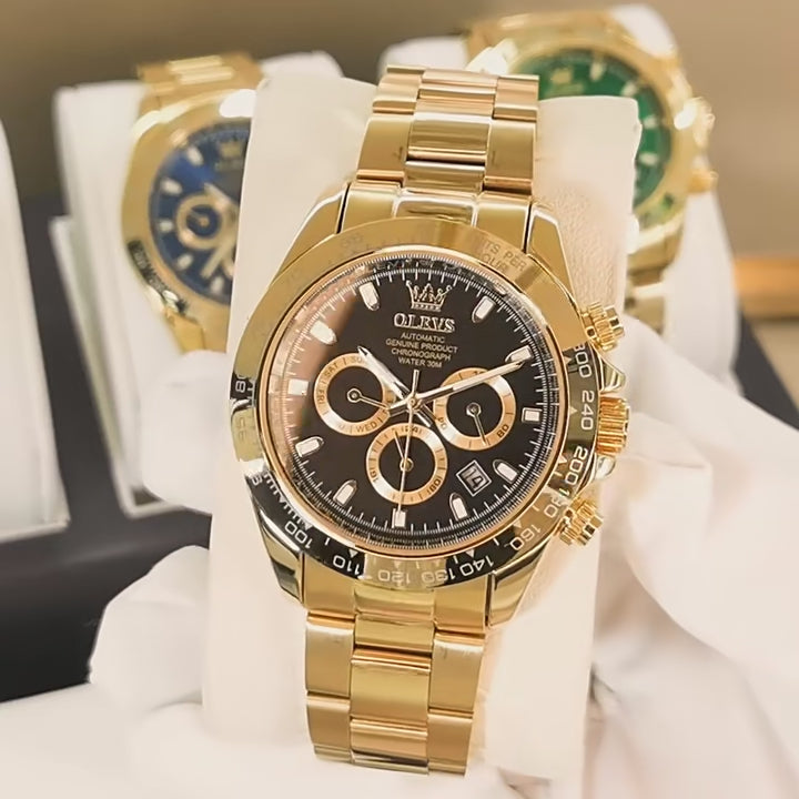 ELEGANCE 6638 Gold Stainless Steel Watches for Men Automatic Chronograph - Gold Bezel & Waterproof & Luminous & Date